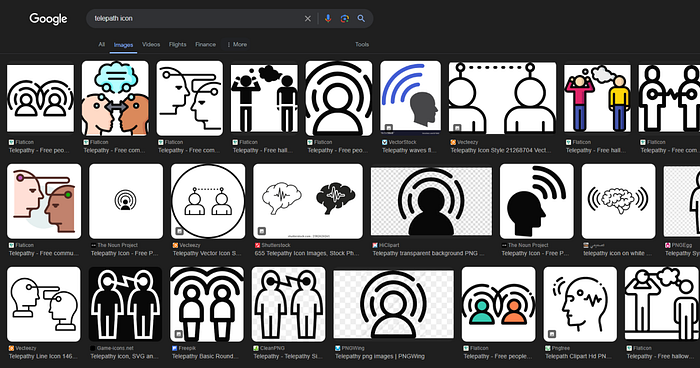 There are multiple ways to gather inspiration. What I usually do is search for the name on Google Images and append the design keywords I prefer. For example, I may try searching for, “Telepath icon”, Telepath symbol”, “Telepath flat”, “Telepath material”, etc. This helps me solidify the name into shapes or symbols.
